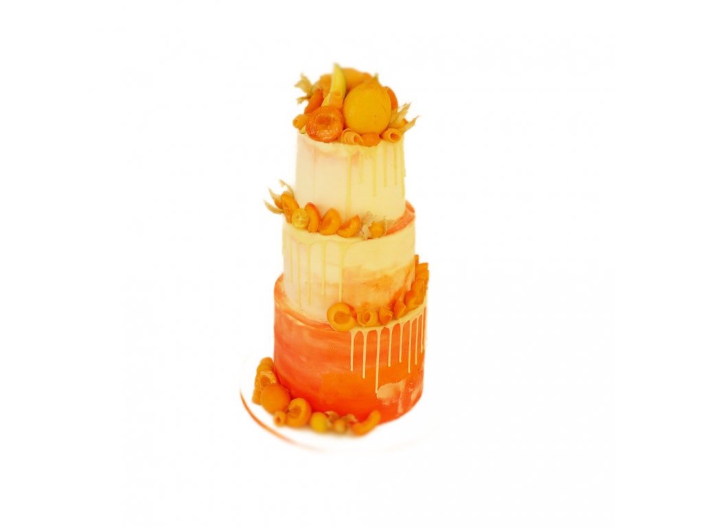 Marcipánem potažený slavnostní nebo svatební dort zdobený čerstvým ovocem. Dort laděný do oranžové a bílé barvy. Základna a dvě patra, stékající čokoláda.