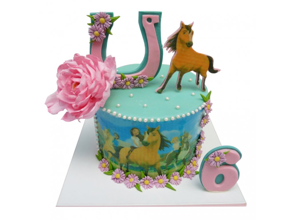 Marcipánem potažený dort s marcipánovými modelacemi, jedlým tiskem obrázku a s růží z jedlého papíru. Lze si vybrat složení náplně a zadat znění vlastního nápisu a číslice.