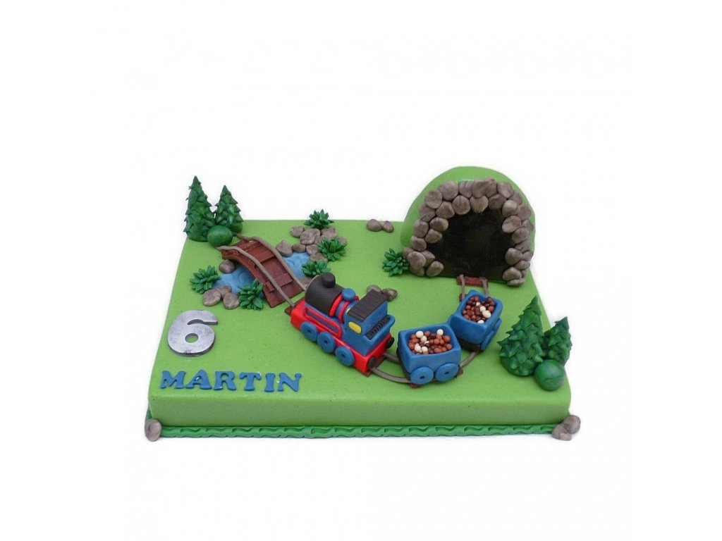 Dětský dort s marcipánovými modelacemi vláčku u tunelu. Lze si vybrat složení náplně a zadat vlastní nápis jména i číslice. Požadavek uveďte prosím v textovém oknu (3.krok v košíku).