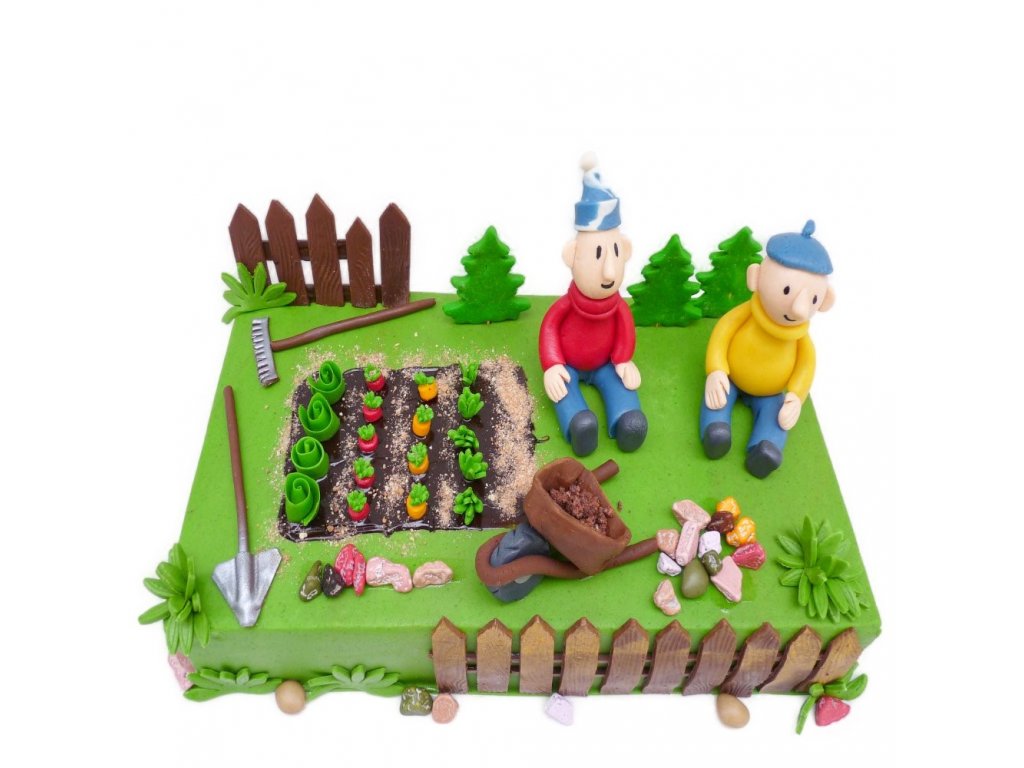 Marcipánem potažený, obdélníkový dort s marcipánovými modelacemi figurek Pat a Mat v tématickém prostředí zahrady. Lze si vybrat složení náplně a zadat vlastní nápis jména i číslice. Požadavek uveďte prosím v textovém oknu (3.krok v košíku).