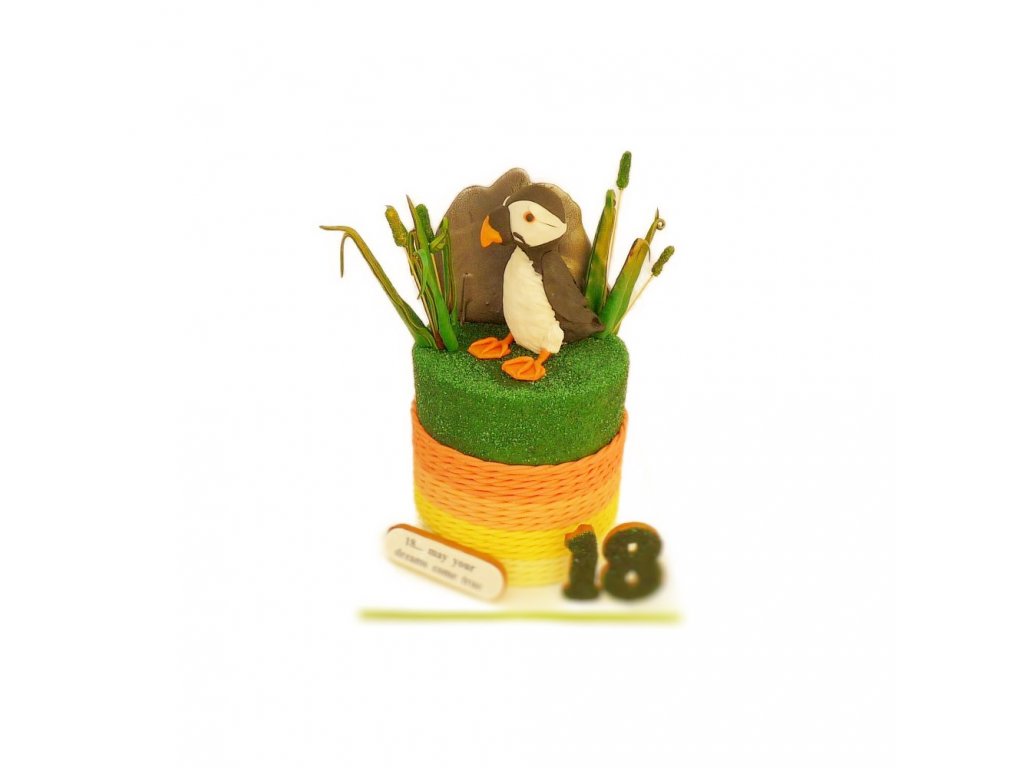 Marcipánový dort s modelovaným papuchalkem, tématickými modelacemi, nápisem a číslicí. Lze si vybrat složení náplně a zadat vlastní znění textu nápisu, nápis jména i číslice. Požadavek uveďte prosím v textovém oknu (3.krok v košíku).
