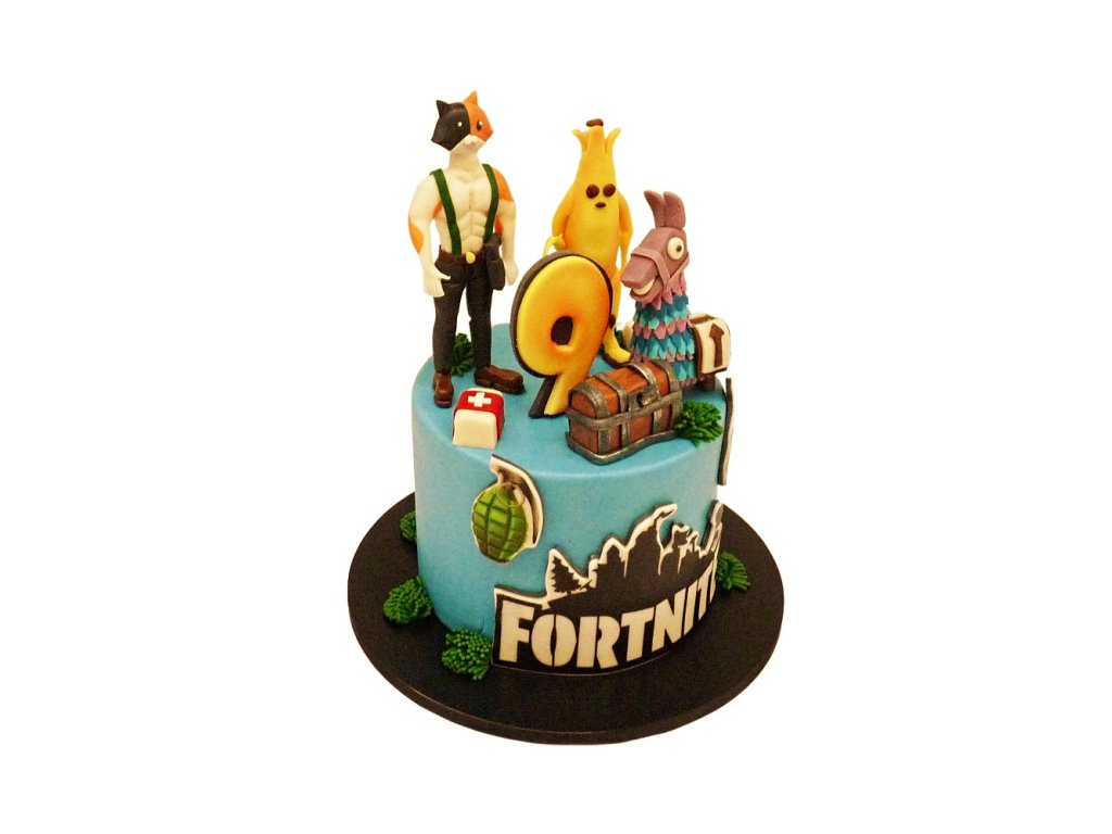 Marcipánem potažený dort s postavami Peely, Meowscles a lama z PC hry Fortnite. Barvu dortu je možné na přání změnit. Lze si vybrat složení náplně a zadat znění vlastního nápisu.