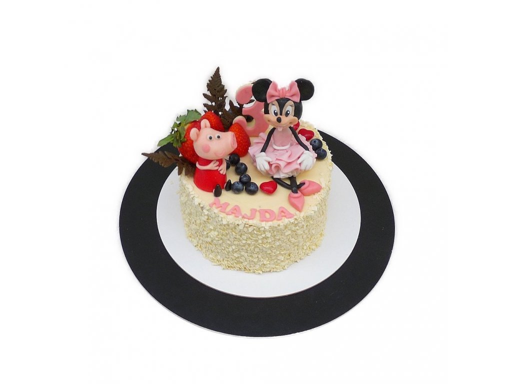 Krémový dort s čokoládovým obsypáním a marcipánovými modelacemi figurek postaviček Peppy a Minnie. Lze si vybrat složení náplně a zadat vlastní nápis jména i číslice. Požadavek uveďte prosím v textovém oknu (3.krok v košíku).