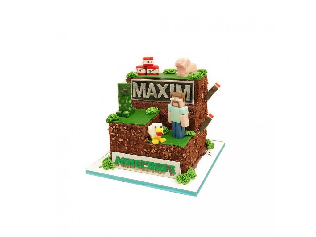 3D tvarovaný stylový dort s modelacemi figurek a tématických doplňků ze hry Minecraft v čoko ořechovém povrchu.