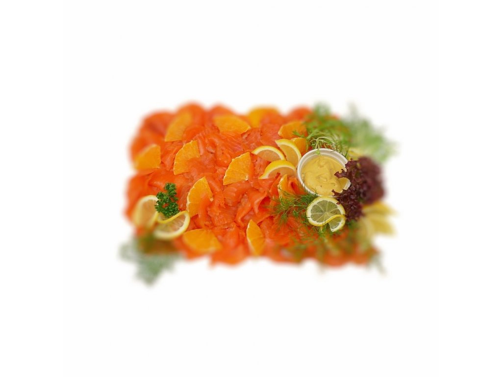 0,5kg plátků lososa uzeného v domácí udírně. Je zdobený pomeranči, salátkem a citronem. Balení s medovou hořčicí v omáčníku.
